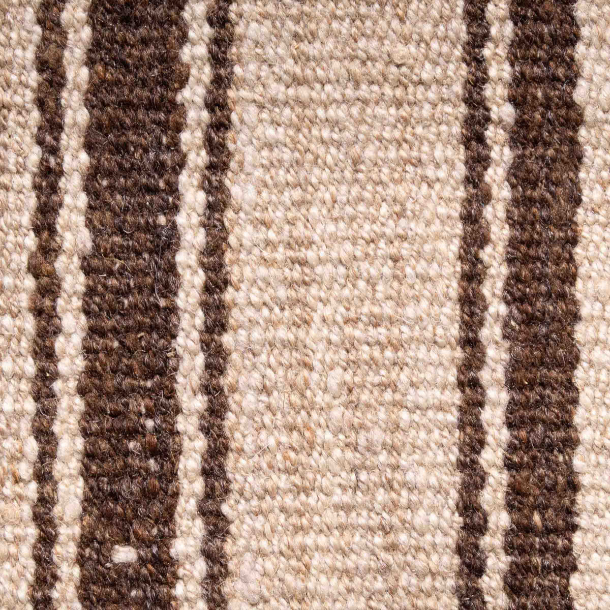 The kilim is woven of eight narrow panels joined into a large square format. Its undyed wool is rich in lanolin, heavy, and densely spun. The light-toned field reveals a broad palette of muted but naturally warm tones—from bone and khaki to dun—punctuated by lengthwise stripes in sepia brown.