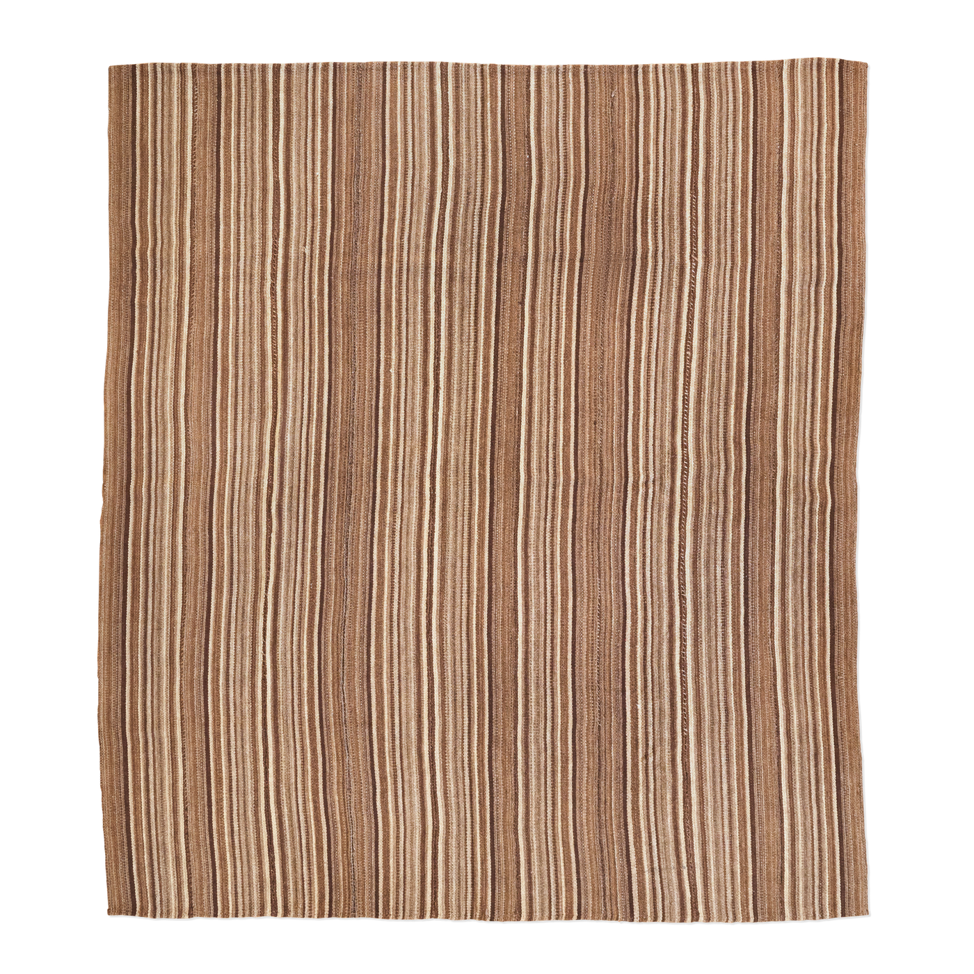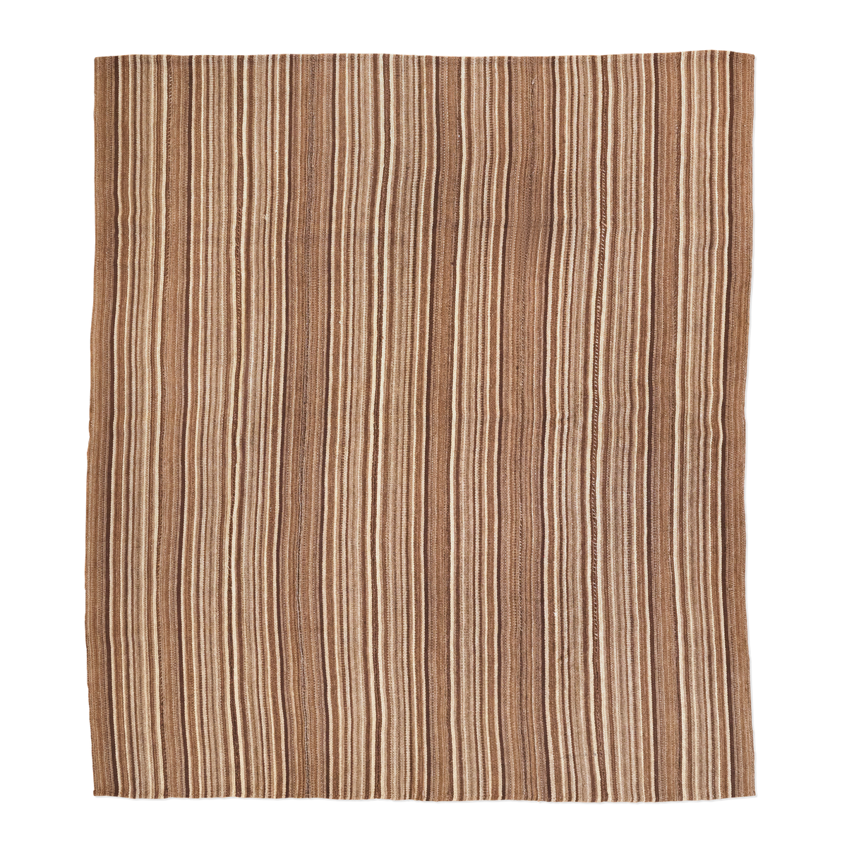 A square, area rug in earthy brown tones, this kilim was handwoven four generations ago in the mountainous highlands of northwestern Persia.