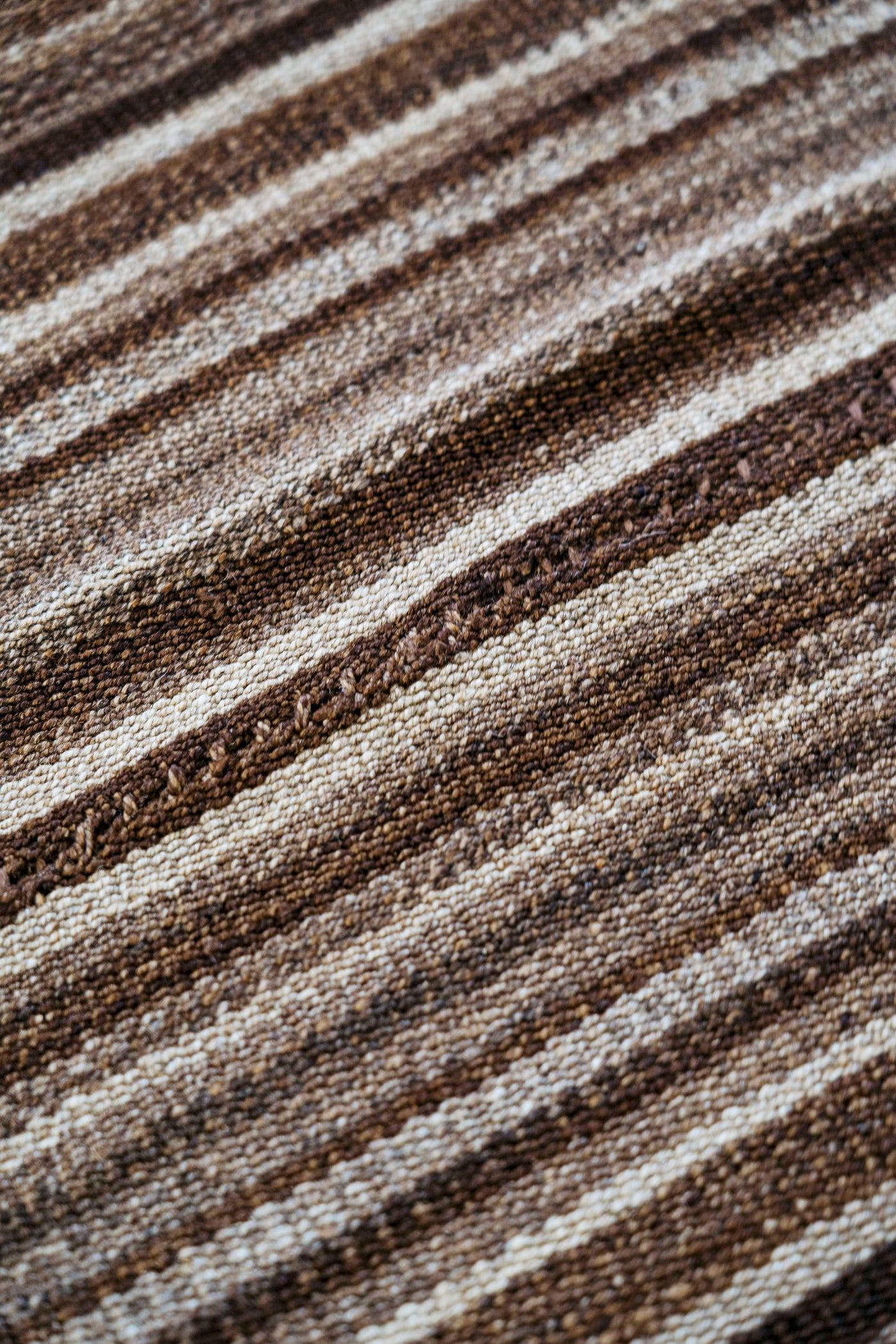 Woven of nine narrow panels joined edge to edge, this rug is made from nearly twenty pounds of lustrous, undyed wool—dense, springy, and tightly spun for longevity across generations. Its natural palette is warm and earthy: alternating stripes of cacao, ruddy hazelnut, taupe, and cream run its full length.