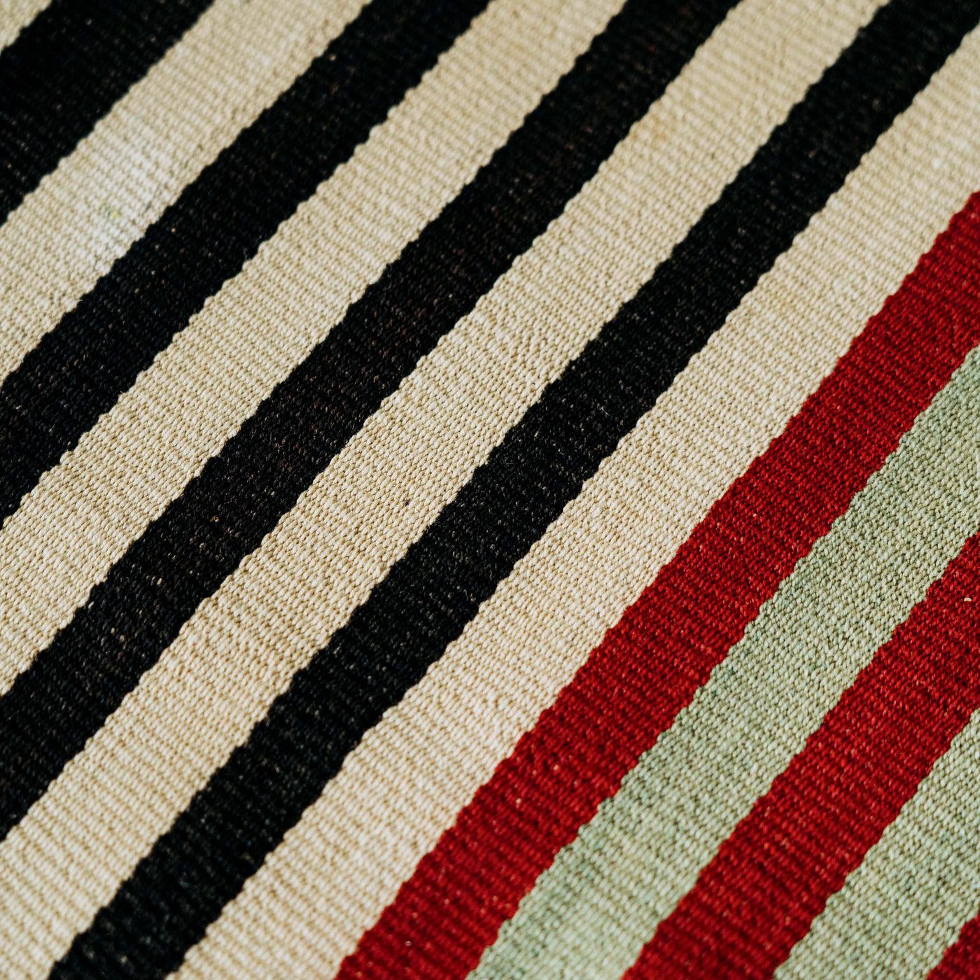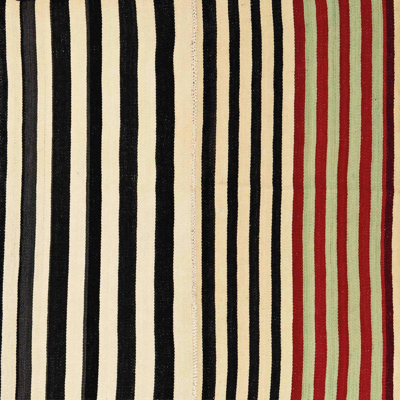 This piece defies that expectation. It draws subtle movement from an array of parallel stripes in alternating black and cream. The composition is framed by a lengthwise border of crimson and blood red stripes spaced with soft pistachio green.