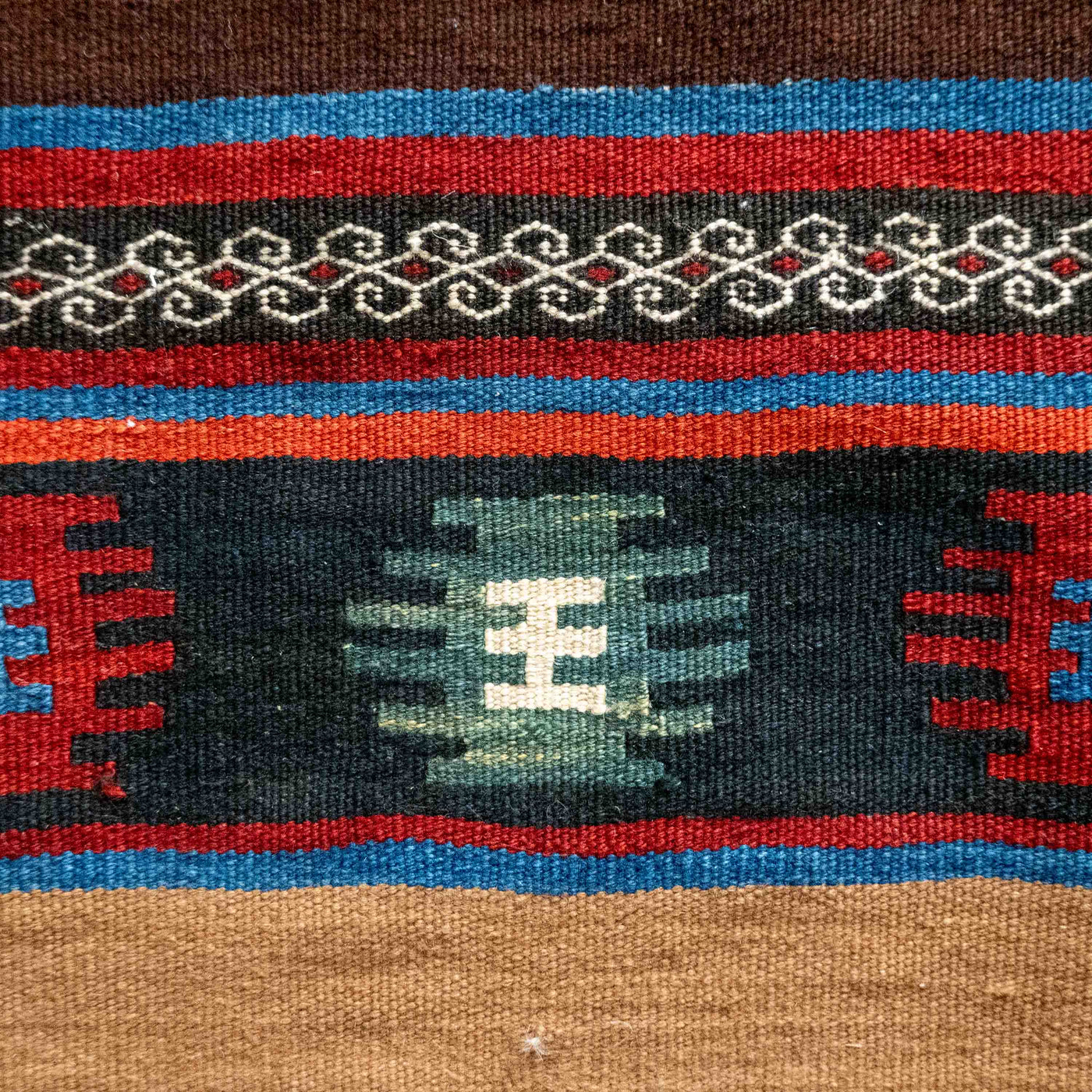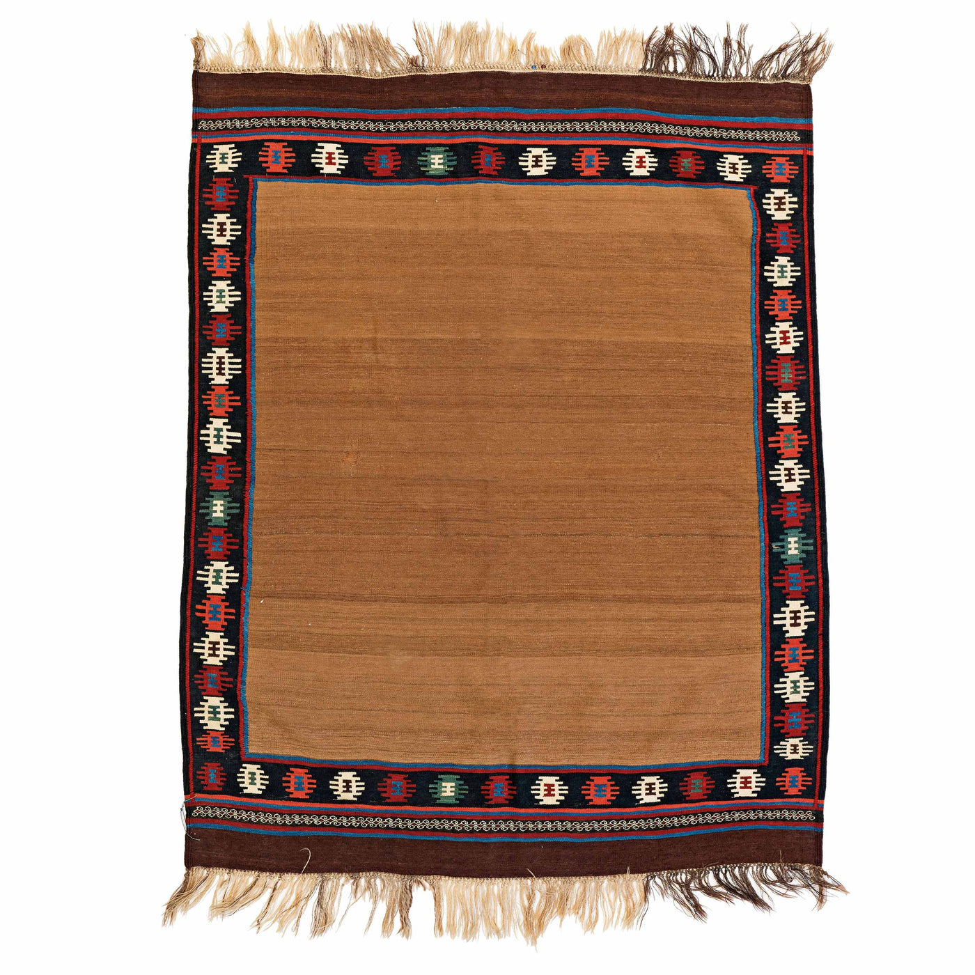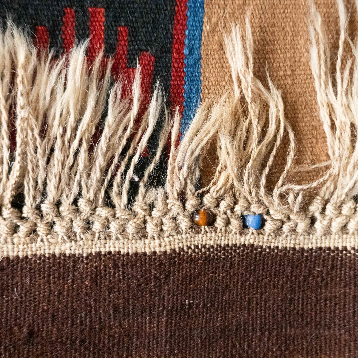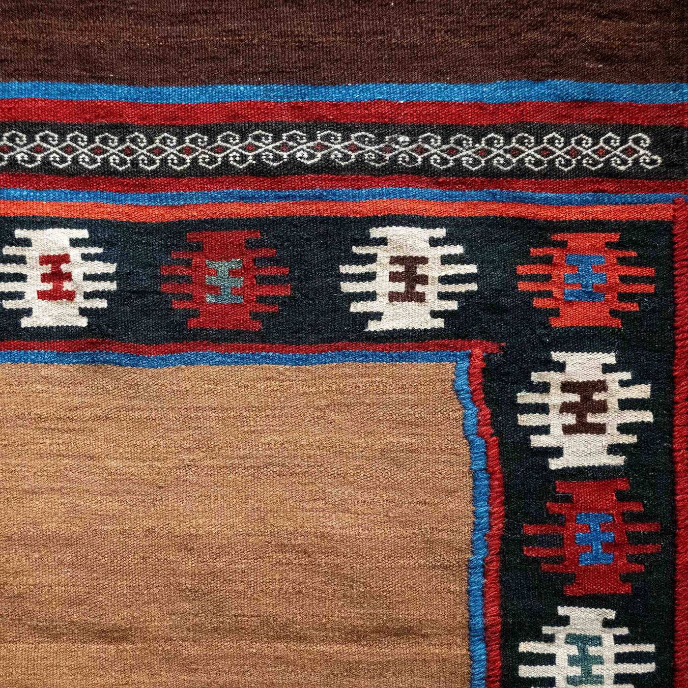 Its field of undyed wool in a warm, bright camel-brown is a hallmark of Kurdish weaving, yet the colorful motifs that form the border are distinctly Shahsevan. The warps are natural cream and brown wool. The weaver has left her mark, stringing two beads into the braided fringe—likely to mark the head of the korsi.
